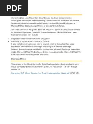 Symantec Data Loss Prevention Overview of Symantec Cloud Service for Email setup lists the steps that you must take to start using your services in the Symantec cloud. Discovery Overview of Service Cloud Service Cloud Console and Case Management Discovery Review and agree upon use cases Analysis Configure Service Cloud in Sandbox Share best practices and implementation planning. See the cross-referenced sections for more details.