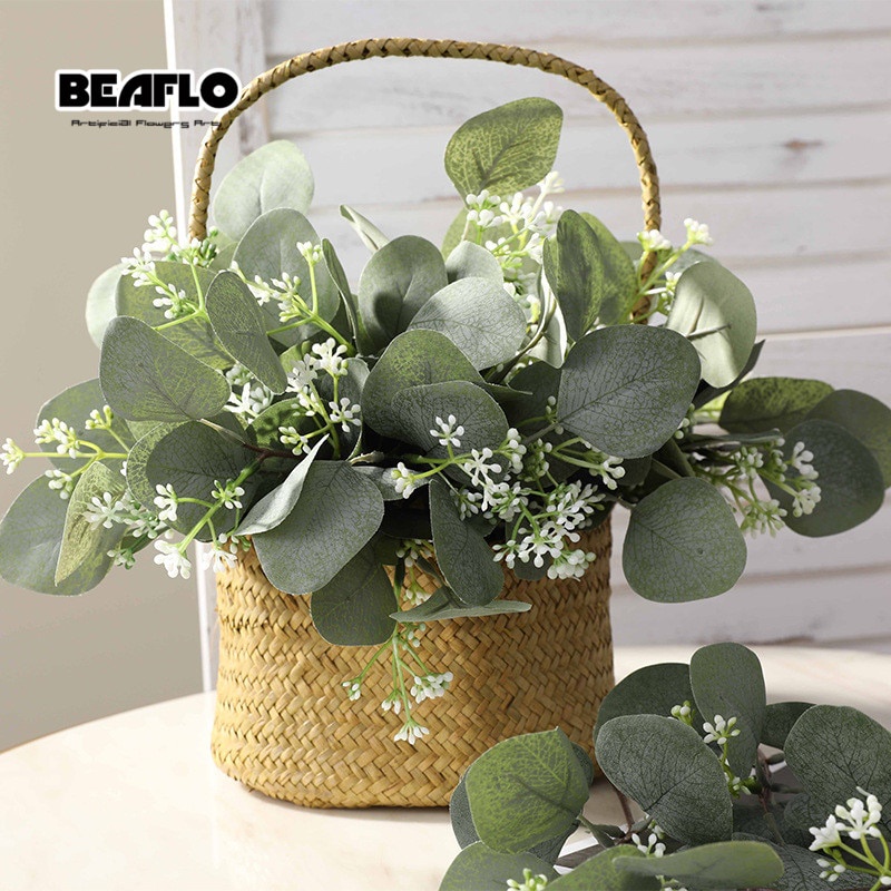 Grinalda floral pintada à mão com ramos folhas de eucalipto semeado e prata dólar isolado sobre fundo branco. Configure o seu arranjo. Além de serem duráveis você não precisará se preocupar com o local de exposição solar nem de regar podar e todos os cuidados que uma planta real necessita.